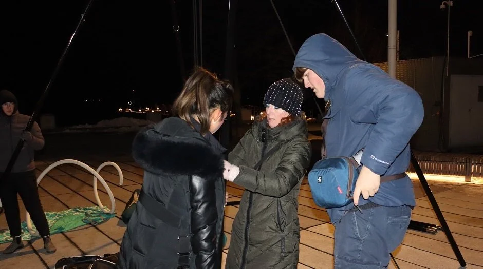 In the photo below you can see the team setting up Beth’s aerial apparatus. I should mention again how cold it was that evening, and make the observation that while the frigid temperatures may have dampened the crowd’s size, it clearly didn’t diminish the enthusiasm of our performers.